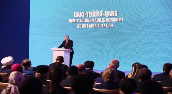 Cumhurbaşkanı Recep Tayyip Erdoğan, “Bakü-Tiflis-Kars Demiryolu” hattının açılış töreninde konuşma yaptı. Erdoğan, “İçinde bulunduğumuz dönemin ötesinde istikbalimiz bakımından çok önemli bir adım atıyoruz. Yeni İpek Yolu girişiminin halkalarından birini hizmete alıyoruz. Bakü-Tiflis-Kars Demiryolu'nun ilk seferinin gerçekleşmesiyle orta koridor projesinin en önemli ayağı tamamlanmış oluyor. Böylece Londra’dan Çin’e kesintisiz demiryolu bağlantısının kurulduğunu da ilan ediyoruz” diye konuştu.