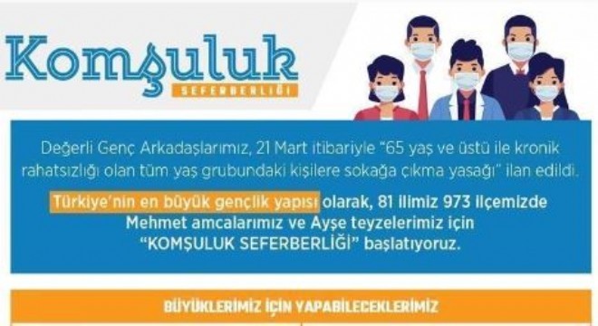 Tüm dünyayı etkisi altına alan ve Türkiye'de de görülen (Kovid-19) Pandemisi, özellikle yaşlıları daha fazla etkiliyor. Bu kapsamda, vatandaşlar hem kendi açısından hem de yaşlılar için daha sıkı tedbirler aldı. İçişleri Bakanlığının aldığı kararlar doğrultusunda, 65 yaş üzeri vatandaşların sağlığı açısında sokağa çıkma yasağı getirilirken, 1.2 milyonu aşkın AK Parti Gençlik teşkilatları 'Komşuluk Seferberliği'ni başlattı. AK Parti Genel Merkez Gençlik Kolları Başkanı ve Yalova Milletvekili Ahmet Büyükgümüş, 'Komşu Seferberliği' ile ilgili yaptığı açıklamada, “Genç arkadaşlarımızdan ihtiyaç halinde dışarı çıktıklarında binalarındaki, sokaklarındaki ve mahallelerindeki büyüklerinin market alışverişi ve acil ihtiyaçlarının teminine yardımcı olmalarını istiyoruz” ifadelerini kullandı.