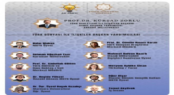 Türk Dünyası ile İlişkiler Başkan Yardımcılığı görevine seçilen isimlerle birlikte yeni dönem hazırlıkları tamamlanmış oldu. AK Parti Genel Başkan Yardımcısı ve Türk Devletleri ile İlişkiler Başkanı Kürşad Zorlu başkanlığındaki yeni yapının yardımcı kadrosu ise dikkat çekici isimlerden oluştu. Akademisyenlerden milletvekillerine, doktor ve yazarlardan gazetecilere, sivil toplum temsilcilerine kadar geniş yelpazede isimlerin yer aldığı kurul şu isimlerden oluşuyor: