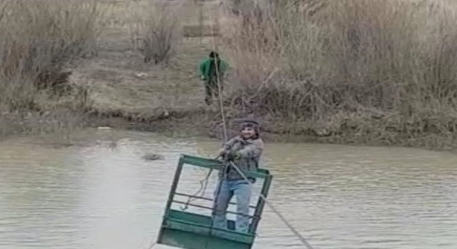 Karların erimesiyle taşan Aras Nehri’ni tehlikeyi göze alarak ilkel teleferikle geçiyorlar.