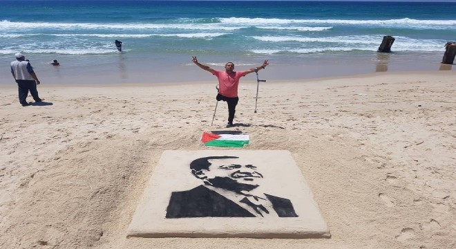 Gazze Savaşı’nda tek bacağını kaybeden Filistinli sanatçı Muhammed Tutah, seçim zaferi dolayısıyla Cumhurbaşkanı Recep Tayyip Erdoğan'ın resmini Gazze sahiline çizdi.