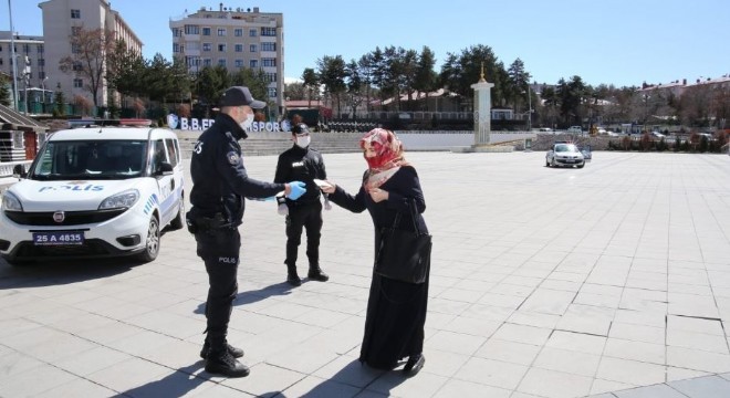 Erzurum’da polisler Korona virüs tedbirleri kapsamında sokaktaki vatandaşlara maske dağıttı.