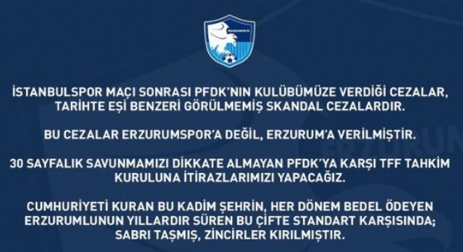 PFDK’nın İstanbulspor maçı sonrasında Erzurumspor’a cezalar yağdırması Mavi Beyazlı Kulüp yönetimi tarafından tepkiyle karşılandı. Kulüp Kurumsal Web sitesinden yapılan açıklamada; ‘Bu cezalar Erzurumspor’a değil Erzurum’a verilmiştir’ denildi.