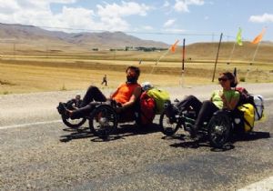 Fransa’nın Paris şehrinde yaşayan Anna ve Nicolas çifti, macera yaşamak üzere 5 ay önce 3 tekerlekli yatay bisikletleriyle dünya turuna çıktı. Sırasıyla, İtalya, Almanya, Makedonya ve Yunanistan gibi ülkeleri geçerek Türkiye’ye giriş yapan Fransız çift, dün öğle saatlerinde Van’ın Özalp ilçesine giriş yaptı. Anna ve Nicolas çift, buraya yaptıkları alışveriş sonrası yollarına devam etti. Dünya turlarını 1 yılda bitirecek olan çift, sırasıyla İran, Türkmenistan, Özbekistan, Tacikistan, Çin, Vietnam, Kamboçya ve Tayland üzerinde Hong Kong’a giderek dünya turlarını bitirecek.