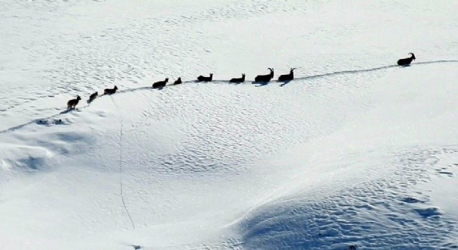 Erzincan ile Tunceli arasında yer alan 3 bin 300 rakımlı Munzur Dağlarında yabani hayvan popülasyonunda artış yaşanırken karlı dağları aşarak göç yoluna koyulan çengel boynuzlu dağ keçisi (şamua) sürüsü görüntülendi.