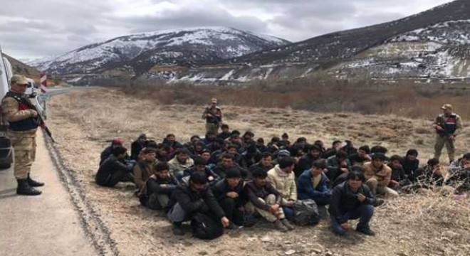 Bayburt merkez Maden köyü yakınlarında jandarma ekiplerince durdurulan 3 minibüs içinde yabancı uyruklu 61 düzensiz göçmen yakalandı.