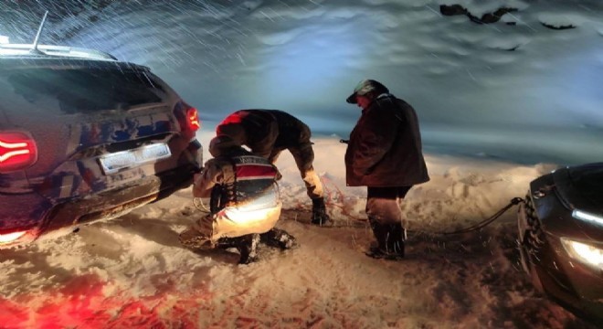 İspir’de jandarma ekipleri karda mahsur kalan vatandaşa ulaştı ve aracıyla birlikte kurtarıldı.
