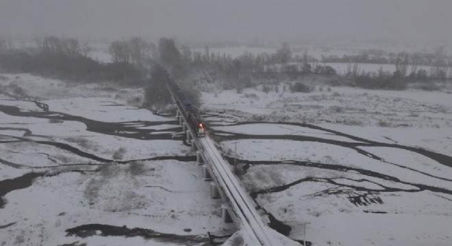 Erzincan’da yağan yoğun kar yağışının ardından her taraf beyaz örtüyle kaplanırken, Doğu Ekspresi treninin Beşsaray köyündeki Fırat Nehri üzerine kurulu köprü üzerinden geçişi masalsı görsel oluşturdu.