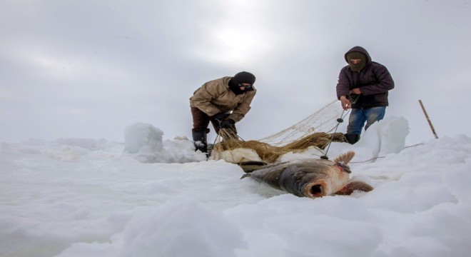 Karasu Nehrinin tamamı buz tutunca balık tutma, burada yaşayan köylülerin gelir kaynağı oldu.