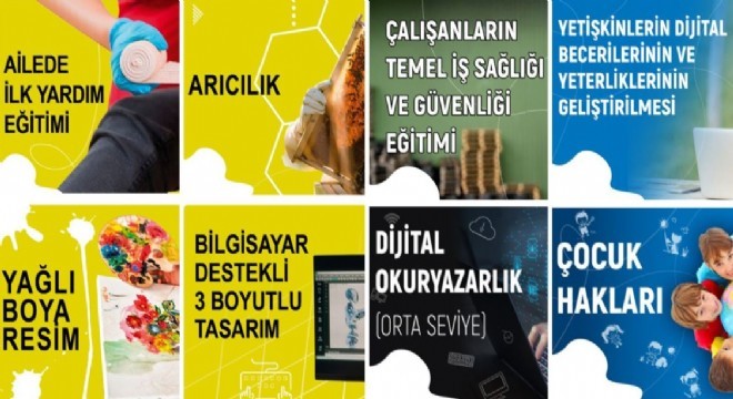 "İşimiz Temiz Projesi Yiyecek İçecek Sektöründeki Mikro İşletmeler İçin Hijyen Eğitimi, İngilizce A1 Seviyesi Kurs Programı, Bilgisayarda Hızlı Klavye Kullanımı, Diksiyon Eğitimi Kurs Programı, Emlak Danışmanlığı, Aşçı Çırağı, İşimiz Temiz Projesi Konaklama Sektöründeki Mikro İşletmeler İçin Hijyen Eğitimi, İngilizce A2 Seviyesi Kurs Programı ile Arıcılık."