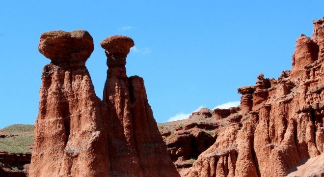 Periler Diyarı ‘Narman Peri Bacaları’ havadan drone ile görüntülenirken, kırmızı rengi ve değişik şekilleri ile göz kamaştırarak ziyaretçilerini bekliyor.