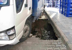 Oltu’da trafikteki kamyonet yolun çökmesi sonucu 1.5 metrelik çukura düştü.