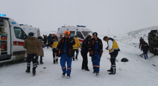 Çat ilçesinde karlı yolda kayan özel halk otobüsü yan yattı. Kazada 2’i polis 18 kişi yaralanırken kaza mahalinde adeta can pazarı yaşandı.