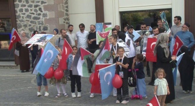 Erzurum Kalesi önünde bir araya gelen doktorlar, üniversite öğrencileri, sağlık çalışanları, STK temsilcileri ve vatandaşlar, Türkiye ve Filistin bayraklarıyla yürüyüş yaptı.