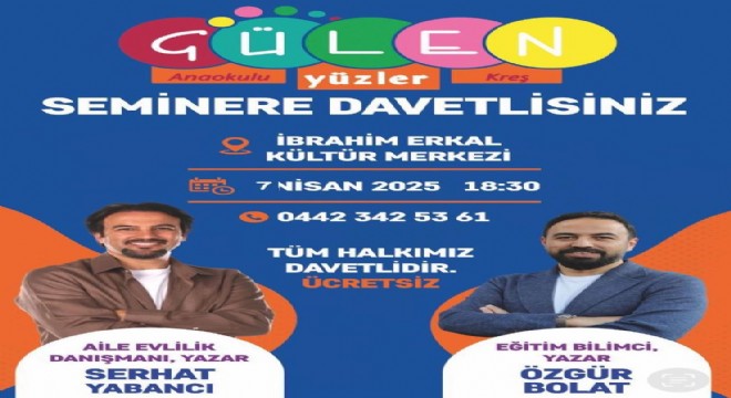 Saat 18:30’da başlayacak seminerde, aile ilişkileri, evlilik danışmanlığı, çocuk eğitimi ve toplumsal gelişim gibi konular ele alınacak. Aile ve evlilik danışmanı, yazar Serhat Yabancı, sağlıklı ilişkiler kurmanın yollarını anlatırken, eğitim bilimci, yazar Özgür Bolat ise eğitim sisteminde çocukların gelişimini destekleyen yaklaşımları paylaşacak.