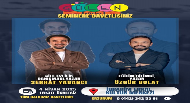 Aile evlilik danışmanı ve yazar Serhat Yabancı ile eğitim bilimci ve yazar Özgür Bolat, Gülen Yüzler Anaokulu ve Kreşi tarafından düzenlenen seminer kapsamında Erzurumlu vatandaşlarla bir araya gelecek.