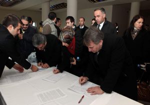 "Tarihi Ermeni sorunu" konulu konferansın ardından öğretmenler hazırladıkları kınama metnini imzaladılar.