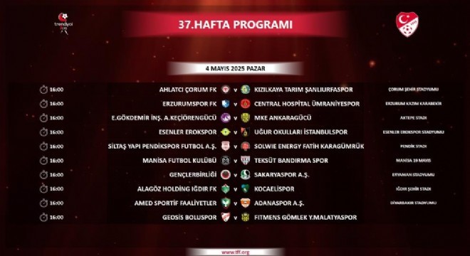 Trendyol 1. Lig'de 37. haftanın programı Türkiye Futbol Federasyonu'nun (TFF) internet sitesinden açıklandı.
