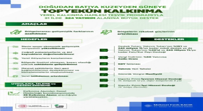 Sanayi ve Teknoloji Bakanı Mehmet Fatih Kacır, "81 ilimizin potansiyelini harekete geçirmek, bölgeler arası gelişmişlik farklarını azaltmak ve her bir ilimizi kalkınma seferberliğimize dahil etmek amacıyla Yerel Kalkınma Hamlesi Teşvik Programı'nı uygulamaya alıyoruz" dedi.