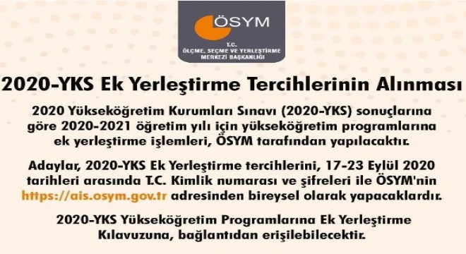 Adaylar, 2020-YKS ek yerleştirme tercihlerini 17-23 Eylül tarihleri arasında T.C. kimlik numarası ve şifreleri ile ÖSYM'nin https://ais.osym.gov.tr internet adresinden bireysel olarak yapacaklar. Ek yerleştirme işlemleri, 2020-Yükseköğretim Kurumları Sınavı Kılavuzu, 2020-YKS Yükseköğretim Programları ve Kontenjanları Kılavuzu ile 2020-YKS Yükseköğretim Programlarına Ek Yerleştirme Kılavuzu'nda belirtilen kurallar doğrultusunda yapılacak.