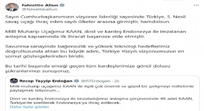 Cumhurbaşkanlığı İletişim Başkanı Fahrettin Altun,"Türkiye, 5. Nesil savaş uçağı ihraç eden sayılı ülkeler arasına girmiştir, hamdolsun. Milli Muharip Uçağımız KAAN, dost ve kardeş Endonezya ile imzalanan anlaşma kapsamında ilk ihracat başarısını elde etmiştir" dedi.