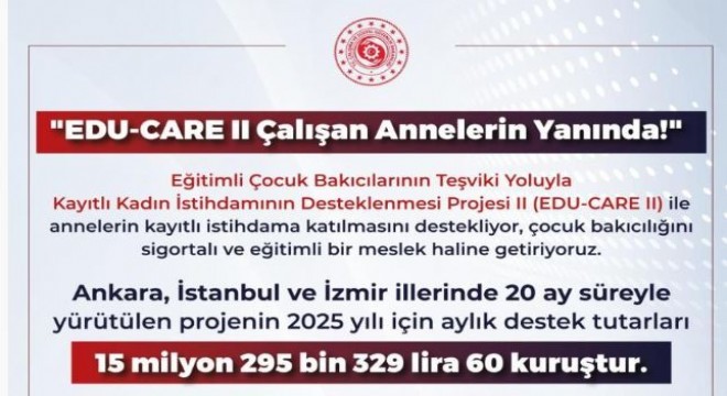 Çalışma ve Sosyal Güvenlik Bakanı Vedat Işıkhan, sosyal medya hesabından yaptığı paylaşımda, “Çalışan annelerin her zaman yanındayız” dedi. Bakan Işıkhan, paylaşımında EDU-CARE II sayesinde annelerin kayıtlı istihdama katılmasını desteklediklerini belirterek, “Sigortalı ve eğitimli çocuk bakıcılığını teşvik ediyoruz. Ankara, İstanbul, İzmir illerinde yürütülen projeye 2025 yılında toplam 15 milyon liradan fazla destek tutarı sağlanacak” ifadelerine yer verdi.