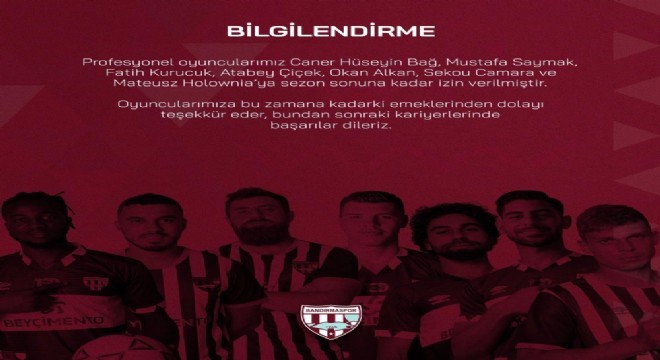 Bandırmaspor, Spor Toto 1. Lig'in 31. haftasında konuk ettiği Erzurumspor karşısında 2-0 öne geçmesine rağmen mücadeleyi 4-2 kaybetmişti. Bordo-beyazlılar, karşılaşma sonrası kulübün sosyal medya hesabından 7 futbolcunun kadro dışı kaldığını açıkladı. Kulüpten yapılan açıklamada, "Profesyonel oyuncularımız, Caner Hüseyin Bağ, Mustafa Saymak, Fatih Kurucuk, Atabey Çiçek, Okan Alkan, Sekou Camara ve Mateusz Holownia sezon sonuna kadar izin verilmiştir. Oyuncularımıza bu zamana kadar ki emeklerinden dolayı teşekkür eder, bundan sonraki kariyerlerinde başarılar dileriz" ifadelerine yer verildi.