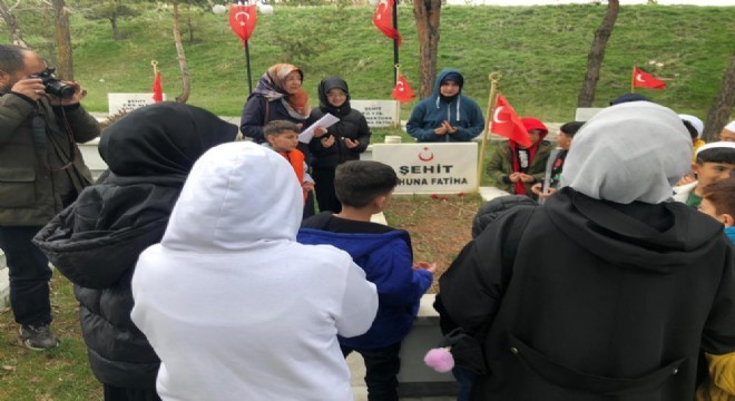 Programda okunan hatimlerin duası yapıldıktan sonra şehit mezarlarını gezen çocuklar, oradaki şehit aileleriyle beraber şehitlerin mezarları başında dua okudu.