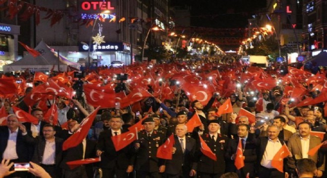 Erzurum’da 15 Temmuz Demokrasi ve Milli Birlik Günü dolayısıyla binlerce vatandaş ellerinde Türk bayraklarıyla demokrasi nöbetini tutmak için meydana akın etti.