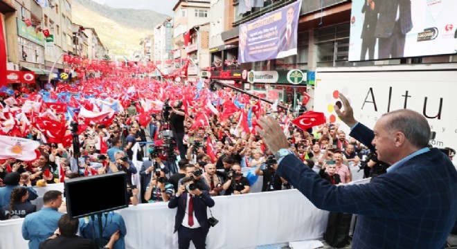 Gümüşhane’den önce Bayburt’ta vatandaşlarla bir araya geldiğini, kendisine, seçimlerde verdikleri rekor destek için teşekkür ettiğini dile getiren Cumhurbaşkanı Erdoğan, “Şimdi de Gümüşhane’nin misafiriyiz. 28 Mayıs’ta yüzde 78,54 gibi tarihî bir oy oranıyla bizlere sahip çıkan Gümüşhane’ye teşekkür ediyorum. Bizimle omuz omuza yürüdüğünüz için, dualarınızda bizleri unutmadığınız için, sandık önünüze geldiğinde mührü bastığınız için sizlere şükranlarımı sunuyorum” diye konuştu.