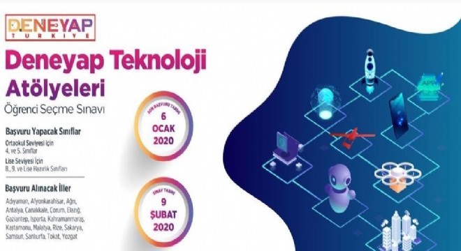 Geleceğin bilim adamları, araştırmacıları, girişimcileri olabilecek öğrencileri ortaya çıkarmayı amaçlayan Deneyap Teknoloji Atölyeleri; Adıyaman, Afyonkarahisar, Ağrı, Antalya, Çanakkale, Çorum, Elazığ, Gaziantep, Isparta, Kahramanmaraş, Kastamonu, Malatya, Rize, Sakarya, Samsun, Şanlıurfa, Tokat ve Yozgat’ta kurulacak. 100 binden fazla başvuru olacağı tahmin edilen Deneyap için iki aşamalı sınav yapılacak. Şubat ayında yazılı sınavı geçen öğrenciler, Mart'ta uygulamalı sınavda ter dökecek. 18 şehirde yaklaşık yeni 2 bin 900 öğrenci Nisan ayında eğitime başlayacak. Her bir şehirde toplam 160 öğrenci eğitim alacak. Bunların yaklaşık 100’ünün ortaokul, 60’ının lise öğrencisi olması öngörülüyor.