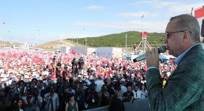 Ak Parti’nin 17 yıllık iktidarının alâmet-i fârikalarından birinin de ulaşım meselesi olduğunu ifade eden Erdoğan, sözlerini şöyle sürdürdü: “Hep derdim, yol medeniyettir: su medeniyettir. Yolunuz yoksa, suyunuz yoksa, siz gayr-i medenîsiniz. Nerede CHP varsa orada susuzluk, çöp var. Öyle mi? CHP’nin belediyelerinin olduğu yerlerde maalesef atık su. Susuzluk almış başını gidiyor. 6100 kilometreden devraldığımız bölünmüş yol uzunluğumuzu bugün 26 bin 764 kilometreye ulaştırdık. 79 senede 6100 kilometre yapıldı. Biz bunu 18 senede 26 bin 764 kilometreye ulaştırdık. Farkımız bu. İktidara geldiğimizde 1714 kilometre olan otoyol uzunluğumuzu bugün 2875 kilometreye çıkardık. Bölünmüş yol ile bağlı il sayısını, kara yolu tren sayısını 83’tden 367’ye, kara yolu tren uzunluğunu 50 kilometreden 473 kilometreye yükselttik. Vatandaşlarımızın hem mal, hem can güvenliğinde iyileştirmeler gerçekleştirdik. Vatandaşlarımızın yol konforunu arttırdık. Kaza riskini minimize ettik. Yaz tatilinde ve önümüzdeki bayram günlerinde yapacakları seyahatlerde trafik kurallarına uymalarını özellikle rica ediyorum. Tüm Türkiye’ye sesleniyorum. Ne olur, işte bu hafta kurban bayramına giriyoruz. Bakın acele giden, Allah göstermesin, ecele gider. Yollarda aman ha; bastırıp hele hele gece yolculuğu, bunlara çok dikkat edin. Sizi bekleyen büyüklerinize yavrularınıza kötü haber ulaştırmayın. Onun için de yolların kuralları vardır. Bu kurallara uyalım, bu kurallara uyarak seyahatimizi yapalım ki, bayramlarımızı acıya döndürmeyelim. Bunu özellikle sizlerden rica ediyorum. Bölünmüş yollar otoyollar, ilk defa inşa ettiğimiz hızlı tren hatları, sayı ve seferlerini arttırdığımız hava limanları, deniz taşımacılığı ile seyahatleri kolay ve güvenli hale getirdik. Ülkemizdeki motorlu araç sayısı 8 milyon 655 bin iken bugün 23 milyonu geçti. Buna karşılık hem yolculuk süreleri kısaldı, hem konfor arttı. Trafik kazalarıyla yaralanma ve ölüm oranları azaldı. Alt yapıyı güçlendirdik. Güvenli trafik anlayışı ile trafik kazalarının azaltılması yolunda önemli mesafe kat ettik. Bu yılın ilk 7 ayında trafik kazalarında yüzde 12’lik, ölümlü kazalarda yüzde 30’luk, yaralanmalı kazalarda yüzde 12’lik azalma meydana geldi. Bunu sürdürmenin yolu vatandaşlarımızın kurallara uymasından geçiyor. Yollarımız gayet rahat, konforlu, bayram sıkışıklığı sebebiyle varsın seyahat süresi uzasın, geride gözü yaşlı, gönlü kırık kimseyi bırakmayalım. Bursa’da ulaştırma yatırımlarını kesintisiz sürdürüyoruz. Şehrimizde hâl-i hazırda toplam maliyeti 1,5 milyar lira olan 18 kara yolu projemizin yapımı devam ediyor. Bunların tamamını da inşallah iki yıla kadar bitiriyoruz. Bursa’ya bu yakışır. Bursa-Bilecik hızlı tren projemizin tamamlanmasının çeşitli aksaklıklar sebebiyle biraz geciktiğini biliyorum. İnşallah sıkıntıları çözüp hem Ankara-Bursa, Bursa-İstanbul arasını 2 saat 15 dakikaya düşürecek bu hattı mutlaka sizlerin hizmetine sunacağız”.