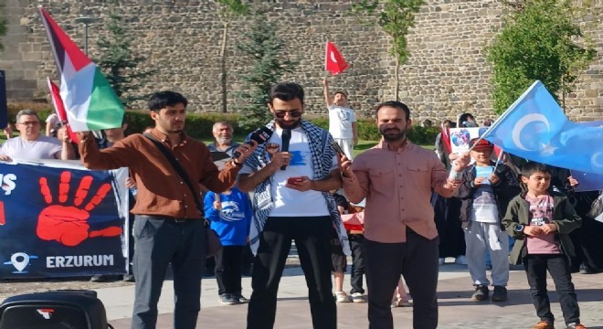 Erzurum Kalesi önünde toplanan grup, 81’inci haftada da zulme karşı seslerini çıkardılar ve yürümeye devam etti. Türk, Filistin ve Doğu Türkistan bayraklarının taşındığı gösteriye vatandaşlarda destek verdi.
