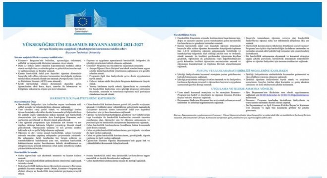 Erzurum Teknik Üniversitesi (ETÜ) Erasmus Koordinatörlüğü’nün 2020 yılının Mayıs ayında Avrupa Komisyonu’na yaptığı Erasmus Charter for Higher Education-ECHE (Yükseköğretim Erasmus Beyannamesi) başvurusu, yapılan değerlendirmeler sonucunda 100 tam puan alarak 2021-2027 dönemi için ECHE Akreditasyonuna sahip olmaya hak kazandı.