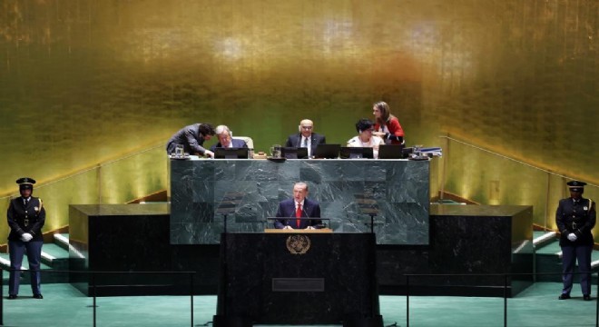 Genel Kurulun bu yılki temasının Türkiye'nin hedefleriyle birebir örtüştüğünü görmekten memnuniyet duyduğunu belirten Cumhurbaşkanı Erdoğan, sözlerini şöyle sürdürdü: "Cumhuriyetimizin 100. yılında hayata geçirmeye başladığımız 'Türkiye Yüzyılı' vizyonumuz, bu örtüşmenin en somut ifadesidir. Küresel adaletsizlikleri ortadan kaldıran, ekonomik eşitsizliklerin üzerine giden, barış, güvenlik, istikrar ve refah üreten, etkili, kapsayıcı ve insanlığı kucaklayıcı, velhasıl tüm insanlığın hayrına bir uluslararası sistemin tesisi çağrımız giderek daha çok yankı buluyor. Genel Sekreter Sayın Guterres'in geçtiğimiz günlerde yaptığı, “İkinci Dünya Savaşı sonrası kurulan kurumların bugünün dünyasını yansıtmadığı” tespitine katılıyoruz. Bu tespit, bizim “Dünya 5'ten büyüktür” çağrımızı ifade ediyor. Güvenlik Konseyi, artık dünya güvenliğinin teminatı olmaktan çıkmış, beş ülkenin siyasi stratejilerinin çarpışma alanı hâline gelmiştir. Kıbrıs'ta yaşanan son hadiseleri, bu içi boşalmış, adalet ve güven telkin etmeyen kurumsal yapının bir tezahürü olarak değerlendiriyoruz. Barış ve istikrarın güçlendirilmesine yönelik sayısız inisiyatife öncülük etmiş bir ülke olarak, Sayın Guterres'in ‘Barış için yeni gündem’ oluşturulması çağrısına önem veriyoruz. Bu anlayışla, Rusya-Ukrayna savaşının başından beri 'savaşın kazananı, barışın kaybedeni olmaz' teziyle hem Rus hem Ukraynalı dostlarımızı masada tutmaya gayret ediyoruz. Savaşın, Ukrayna'nın bağımsızlığı ve toprak bütünlüğü temelinde, diplomasi ve diyalogla sona erdirilmesine yönelik çabalarımızı artırarak sürdüreceğiz."