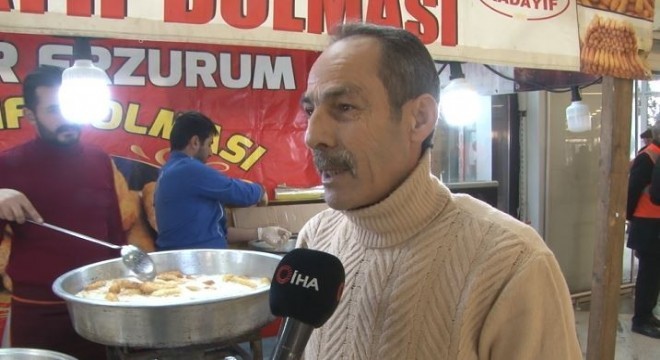 Dolma kadayıf ustası Sönmez Aslan ise dolma kadayıfıyla Erzurum’un tanıtılmasına katkıda bulunduklarını belirterek, “Burada Erzurum’un Meşhur kadayıf dolmasını yapıyorum. Erzurum’u tanıtmak için geldik. Kadayıf dolmamız ad üstünde kadayıftan yapılıyor. Kadayıf dolması görüldüğü üzere önce sarılarak şekli verilir. Sonra da yumurtaya bulanıp kızgın yağda kızartılır. İyice kızardıktan sonra da şerbete bulanıp servise hazır olur” ifadelerini kullandı.