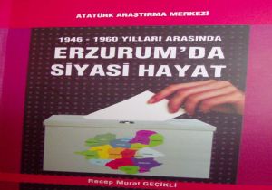 Erzurum’un 1946 ile 1960 yılları arasını kapsayan yakın siyaset tarihi, Dr. Recep Murat Geçikli’nin kaleminden kitap haline getirildi. “1946-1960 Yılları Arasında Erzurum’da Siyasi Hayat” adını taşıyan kitap, Ankara Atatürk Araştırma Merkezi tarafından bastırılırken, eserde, Erzurum’un yakın geçmişindeki önemli siyasi olaylar anlatılıyor. Beş ana bölümden oluşan kitabın ilk bölümünde, Demokrat Parti’nin Erzurum’daki ilk etkinlikleri, 1946 Erzurum’u, seçim hazırlıkları, Demokrat Parti ile CHP’nin uzlaşması ele alınıyor.