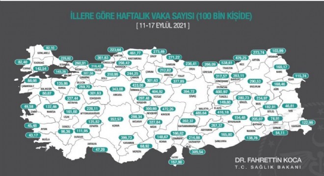Sağlık Bakanı Fahrettin Koca, 11-17 Eylül'de illere göre her 100 bin kişide görülen Covid-19 vaka sayılarını açıkladı.