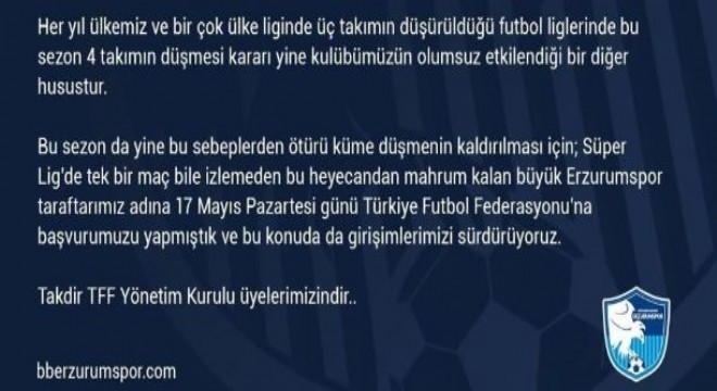 Küme düşmenin kaldırılması için TFF’ye başvuru yapıldığı belirtilen mavi-beyazlı kulübün sosyal medya hesabından yaptığı açıklamada, "Bu sezonda da küme düşmenin kaldırılması için gerekli adımlar atılıyor. Süper Lig'de tek bir maç bile izlemeden bu heyecandan mahrum kalan büyük Erzurumspor taraftarımız adına 17 Mayıs günü TFF'ye başvurumuzu yaptık. Bu konuda da girişimlerimizi sürdürüyoruz" ifadeleri kullanıldı.