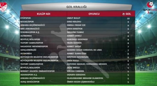 Spor Toto 1’inci Ligde ilk yarının en golcü futbolcusu Eyüpsporlu Umut Bulut oldu. 10 gol atan bu futbolcuyu 9 golle Kocaelispor’dan Dıno Ndlovu, Ankara Keçiörengücü’nden Emeka Frıday Eze, Mke Ankaragücü’nden Eren Derdiyok, İstanbulspor A.Ş.’ den İbrahim Yılmaz, 8 golle Altınordu’dan Ahmet Dereli, Beypiliç Boluspor’dan Kabongo Kasongo, Yılport Samsunspor’dan Yasin Öztekin, 7 golle Nasadoge Menemenspor’dan Ahmet Sağat, Gençlerbirliği’nden Sandro Cesar Cordovıl De Lıma, 6 golle Altınordu’dan Ahmet İlhan Özek, Büyükşehir Belediye Erzurumspor’dan Arvydas Novıkovas Büyükşehir Belediye Erzurumspor’dan Eren Tozlu takip etti.