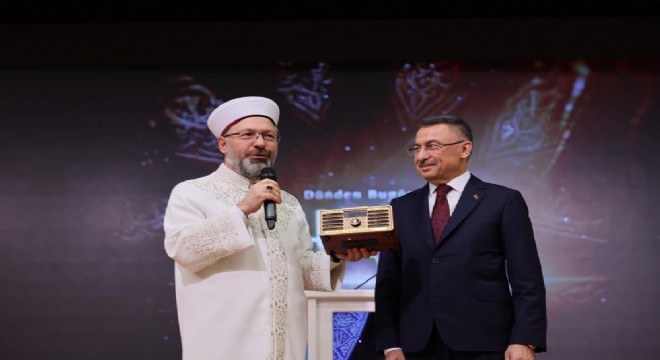 Diyanet İşleri Başkanı Erbaş, program sonunda Cumhurbaşkanı Yardımcısı Oktay'a hac kitaplığı seti hediye etti.