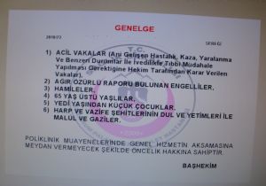Erzurum il Sağlık Müdürlüğü tarafından yapılan açıklamaya göre, Sağlık Bakanlığı’nca 20 Ekim 2010 tarihinde yayımlanan genelge kapsamında poliklinik muayenelerinde öncelik sırası şöyle oldu;