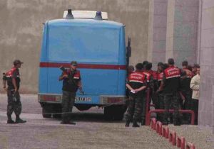 Erzurum İkinci Ağır Ceza Mahkemesi'ndeki duruşma öncesi, tutuklu sanıkların adliyeye getirilişi sırasında adliye binasında polis güvenlik önlemleri aldı.