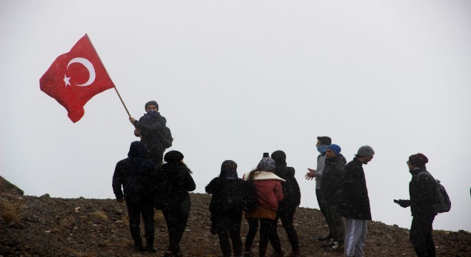 Erzurum’da 29 Ekim Cumhuriyet Bayramı’nnda amatör dağcılar ve öğrenciler, kar yağışı altında Palandöken’in 3 bin 176 metredeki zirvesine tırmandı.