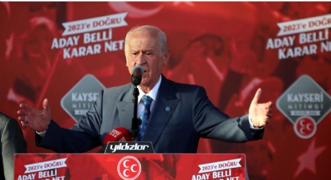 Kayseri Cumhuriyet Meydanı'nda düzenlenen mitingde alanı dolduran vatandaşlara seslenen MHP Lideri Bahçeli; "Bakıyorum da, Kayseri yine çok güzelsin, yine düşman çatlatıyorsun, yine ve yeniden güven veriyorsun. Bu muhteşem heyecanınıza, bu gıpta edilecek coşkunuza, göz kamaştıran sevginize helal olsun diyorum. Başını çevirince Erciyes’i görmüyorsan, bu nice yaşamaktır? Başını kaldırınca bayrağı görmüyorsan, bu nasıl var olmaktır? Hamd olsun başımız diktir, bahtımız açıktır, Kayseri ayaktadır. Bastığımız toprak belli, tuttuğumuz bayrak belli, mensup olduğumuz millet bellidir. Ve adı Türk’tür, nitekim ezelden ebede büyük bir kültür, tarih ve medeniyet hazinesidir. Yürekten inanmaktayım ki, bugünkü açık hava toplantımız, millet hayatımızda ve milli tarihimizde, Türk milleti ve Türkiye Cumhuriyeti’nin 2023 umutlarının müjdesi olarak anılacaktır. Türkiye üzerinde melanet kurgusu olanların Kayseri’nin ihtişamına bakarak kendi hisselerine düşen gerekli dersleri çıkarmalarını tavsiye ediyorum. Buradan yükselen ses, Türkiye’nin milli onurunu, milli haysiyetini kıyamete kadar koruma ve kollama iradesinin bir meydan okumasıdır" dedi.