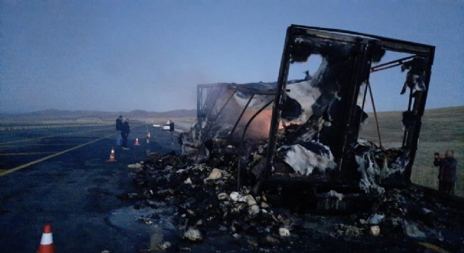 Kars'ta hareket halindeki kamyon alev alev yandı. Tamamen yanan kamyon kullanılmaz hale geldi.