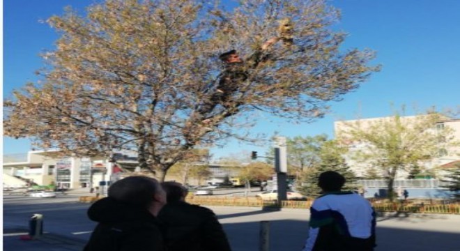 Erzurum'da ağaçta mahsur kalan kedi iki gencin çabalarıyla kurtarıldı.