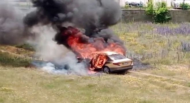 Erzurum'da boş arazide park halinde bulunan taksi bir anda ön kısmından alev aldı ve sonrasında adeta ateş topuna döndü.