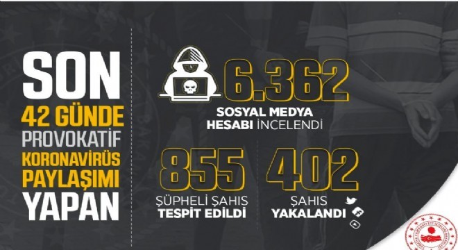 İçişleri Bakanlığı sosyal medya hesabı üzerinden yaptığı paylaşımda korona virüs salgını çerçevesinde asılsız ve provokatif paylaşım yapan 402 kişinin yakalandığını bildirdi. Bakanlık paylaşımında, “ Sosyal medyada son 42 günde, asılsız ve provokatif Korona virüs paylaşımları yapan; 6 bin 362 sosyal medya hesabı incelendi, 855 şüpheli şahıs tespit edildi, 402 şahıs yakalandı” notu düşüldü.