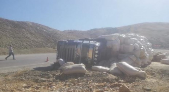 Tunceli’nin Pertek ilçesinde sürücüsünün direksiyon hakimiyetini kaybettiği saman yüklü tır devrildi. Kazada, sürücü yaralandı.